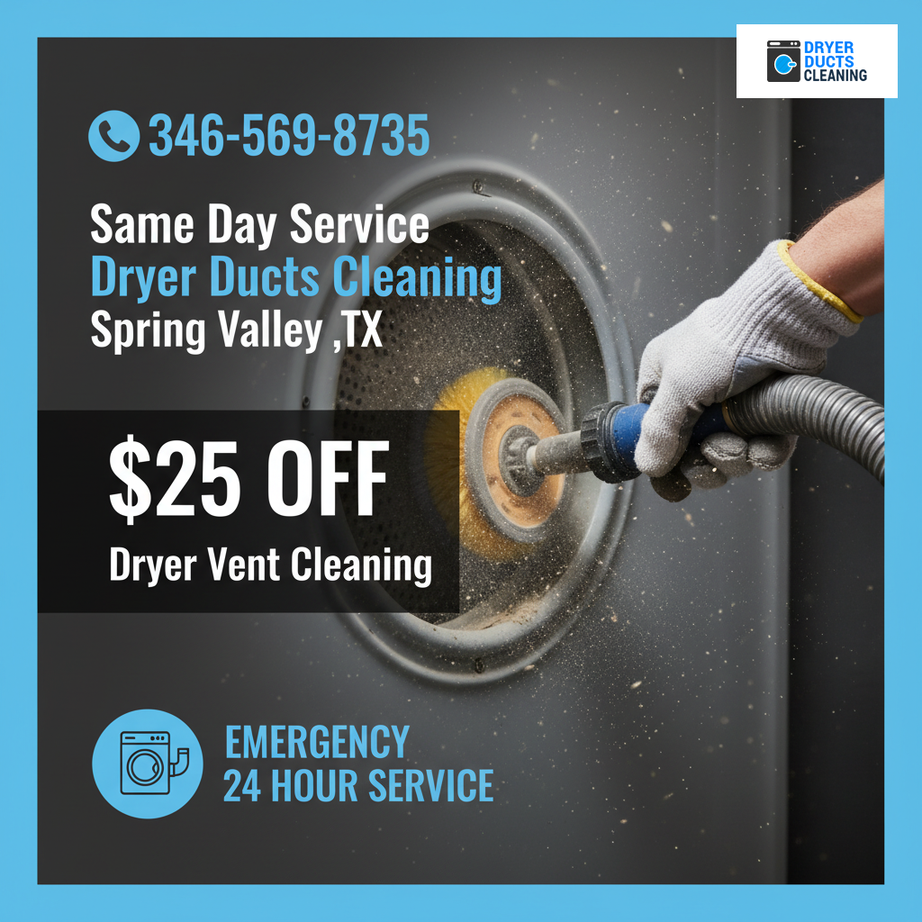 Clogged dryer vents reduce airflow forcing your dryer to work harder and increase energy bills. Spring Valley Dryer Duct Cleaning TX specializes in lint removal and dryer ducts cleaning near me to keep your system running efficiently. Frequent cleaning increases dryer dependability lowers the risk of fire and extends the unit's life.
